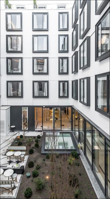 Per conservare il patrimonio architettonico del grande palazzo d’epoca della rue du Helder, gli architetti di Atelier Cos hanno mantenuto e restaurato gli edifici del 19° secolo, compresa la facciata in boiserie. Due nuove estensioni completano il progetto architettonico. La prima aggiunge profondità al palazzo adiacente mentre la seconda consente di creare un collegamento tra i due edifici esistenti. La nuova configurazione, a forma di U, ha permesso di ingrandire gli ambienti interni per una migliore accoglienza dei clienti e di realizzare un piacevole giar dino nel cortile interno.