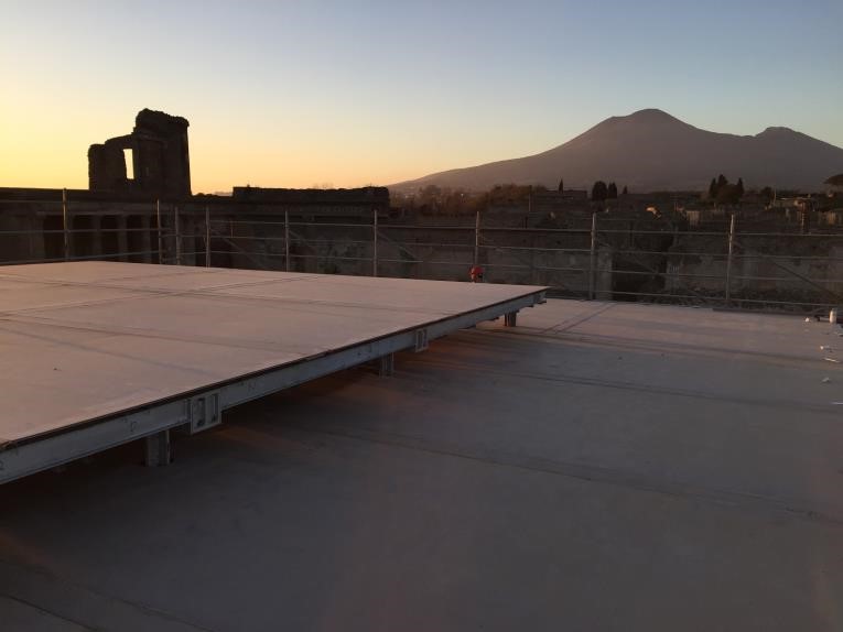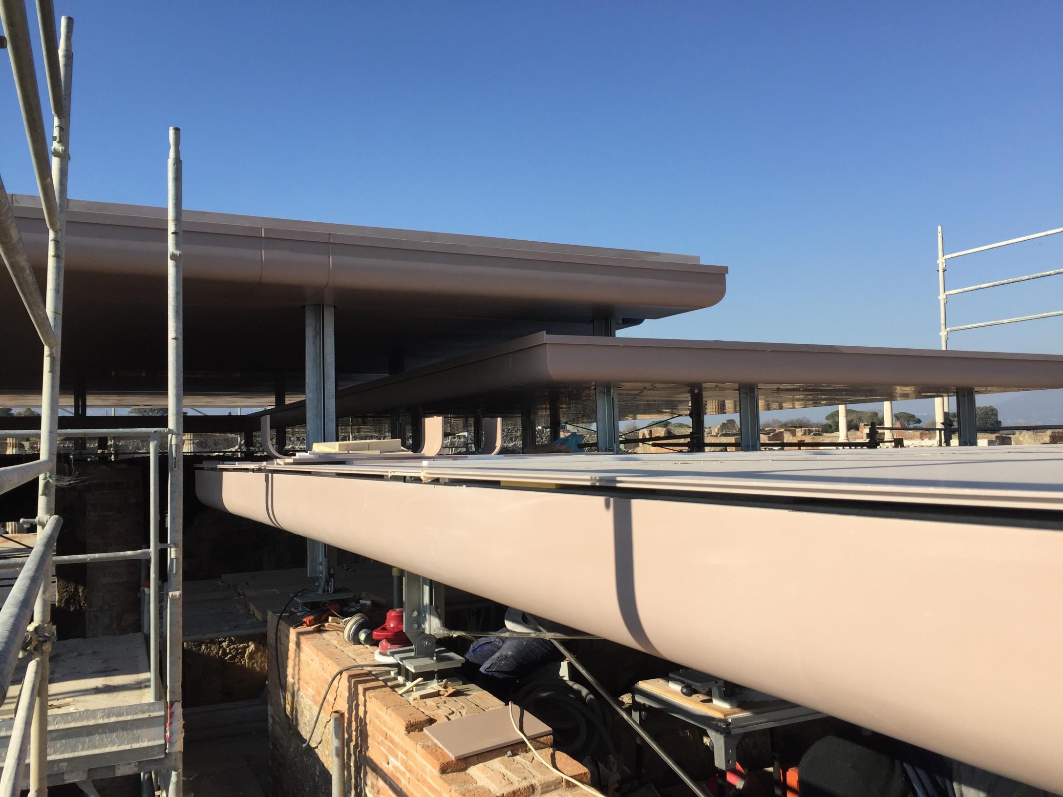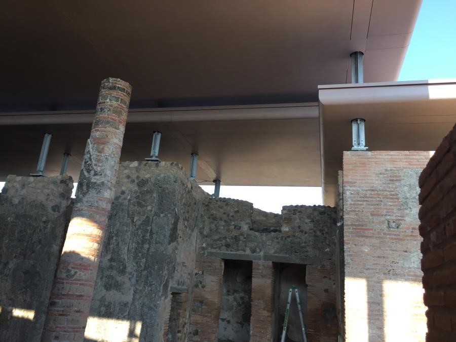 Ogni copertura è ancorata alle parti superiori delle mura ricostruite per mezzo di pilastri in acciaio appoggiati su stabilizzatori antisismici. A occhio nudo, la struttura protettiva sembra quasi galleggiare sopra le rovine. La copertura più grande a tre stati è composta da una parte superiore di forma rettangolare mentre gli elementi intervallati sottostanti sono a forma di L e sono stati realizzati su misura per rispondere alle specifiche esigenze di protezione e supporto del sito. La direzione del parco ha apprezzato l’innovativa struttura che offre nuove possibilità senza tuttavia distogliere l’attenzione dei visitatori dalla principale attrazione: il ricco patrimonio architettonico e culturale dell’antica Pompei.