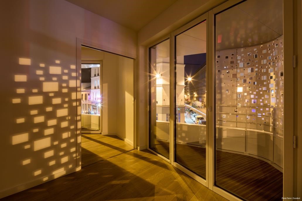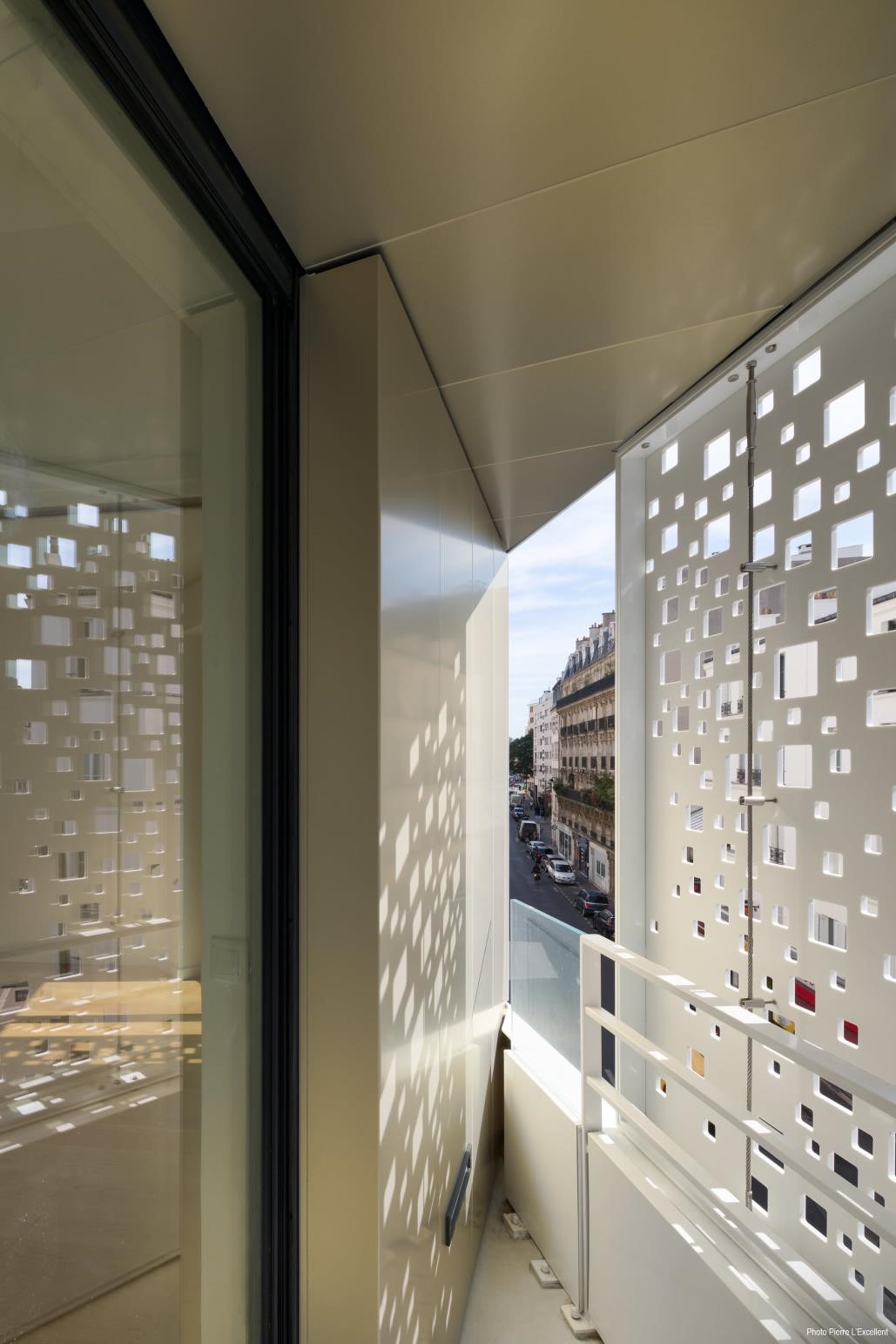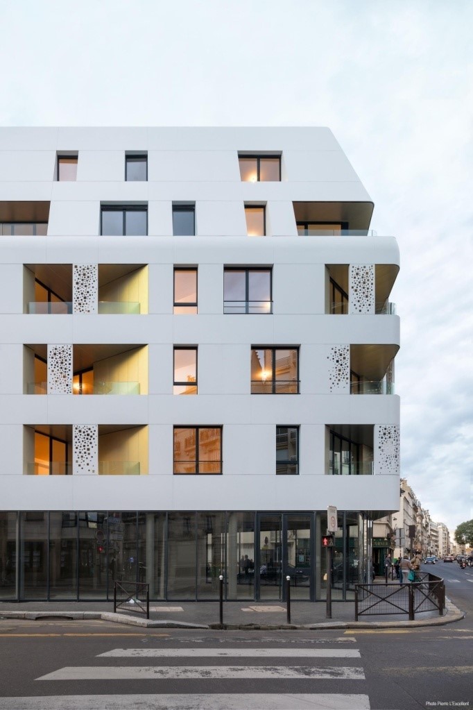 Edificio en el barrio Croix Nivert del distrito XV de París. La fachada en Corian® Solid Surface Glacier White está hecha de paneles de protección solar junto con amplios paneles verticales termoformados para la cubierta. Los espacios exteriores de los apartamentos están protegidos por paneles enrejados y labrados en Corian® Solid Surface con perforaciones variables, permitiendo así a través de ellos la entrada de luz natural y ofreciendo el placer de estar cobijado en una zona exterior. Proyecto de Nakache & Orihuela Architectes; foto Pierre L’Excellent, todos los derechos reservados.