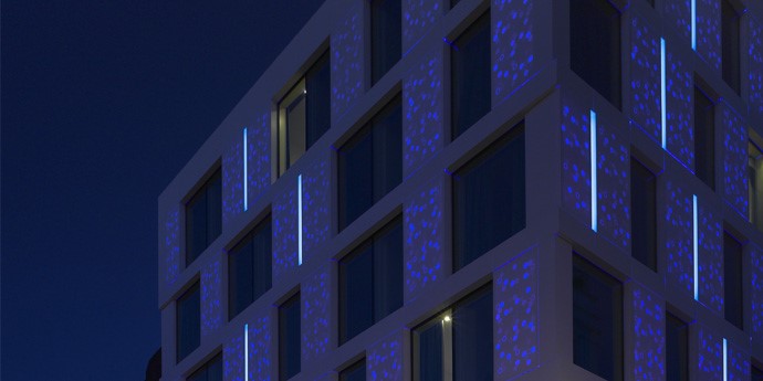 Gwyn Richards of the City of London comments: “The building’s vibrant and playful facades demonstrate that new hotel buildings need not have bland, monotonous and repetitive facades. The ground-breaking use of DuPont™ Corian® as a facing material is innovative and convincing, both during the day and also when illuminated at night. The building demonstrates the importance of an ingenious architectural approach being carried through to implementation, in terms of the integrity of the original architectural concept, but also the highest quality of detailing and materials.