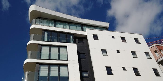 DuPont™ Corian® is increasingly being used as a high-tech façade and exterior cladding material. For example, on an apartment building in Knokke, Belgium, which has been built with its façade and cornice work in Glacier White. The attractive surface is resistant to all the effects of the North Sea climate.