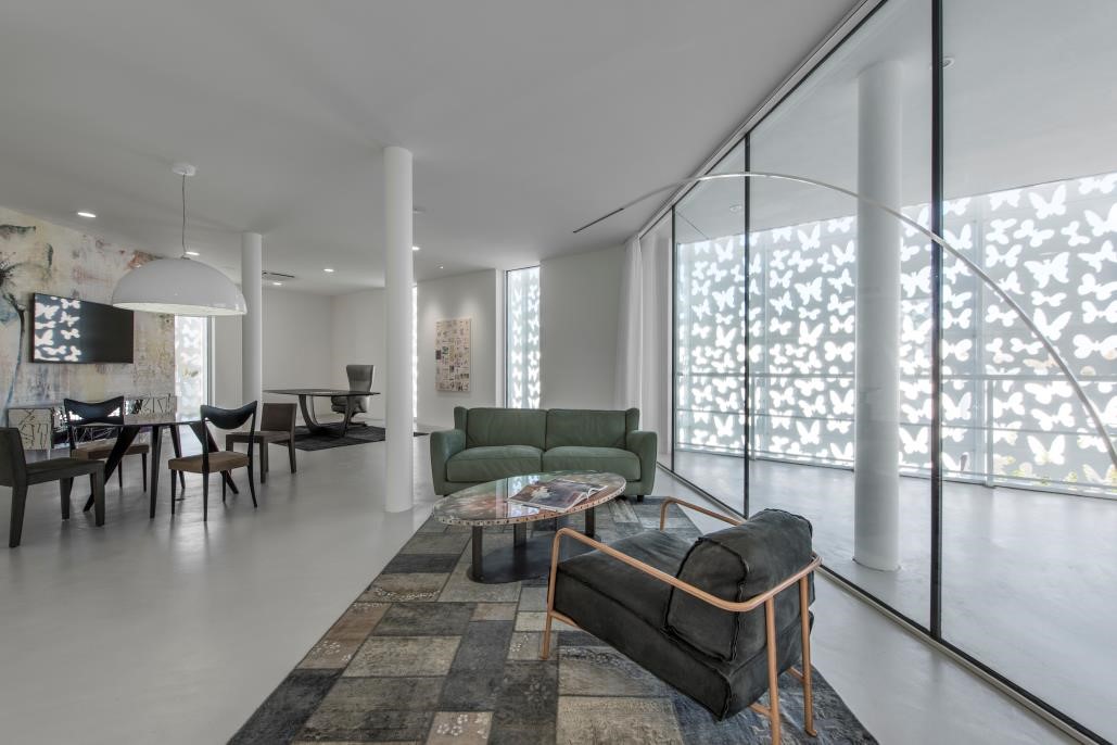 La façade de l’headquarter, un élément de grand impact visuel, a été réalisée avec des panneaux de Corian® Exteriors, une solution innovante basée sur la solid surface Corian®, et le travail décoratif qui la caractérise a été conçu pour attirer les regards, émouvoir et surprendre. Beppe Riboli a su exploiter habilement la polyvalence du matériau pour exprimer sa propre vision créative, un design léger et élégant représentant un essaim de papillons, sur la solid surface Corian®. La façade perforée s’habille de plusieurs visages, rétroéclairée la nuit ou resplendissante quand la lumière du soleil se reflète sur la surface tout en reproduisant des subtils jeux d’ombres et lumière.