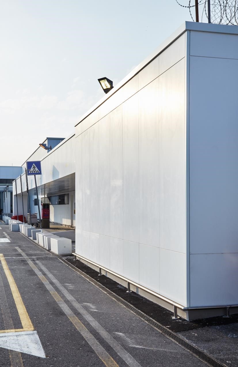 La nouvelle façade de l’aéroport de Milan Linate a été réalisée avec Corian® Exteriors, une solution de revêtement extérieure basée sur Corian® Solid Surface;projet Studio Cerri & Associati; photo Filippo Pincolini pour Corian® Design, tous droits réservés.