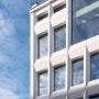 La facciata principale e l'ingresso dell'edificio si distinguono con delicatezza dai palazzi circostanti. La parte superiore è rivestita da una struttura omogenea e tridimensionale realizzata con 141 metri quadrati di pannelli Corian® Exteriors, in cui sono ritagliate ampie finestre che permettono alla luce naturale di penetrare all'interno. Questo luminoso prospetto contrasta nettamente con il piano terra di colore scuro, dove la porta d’ingresso, poco visibile, si inserisce perfettamente nell'angolo delle alte vetrate.